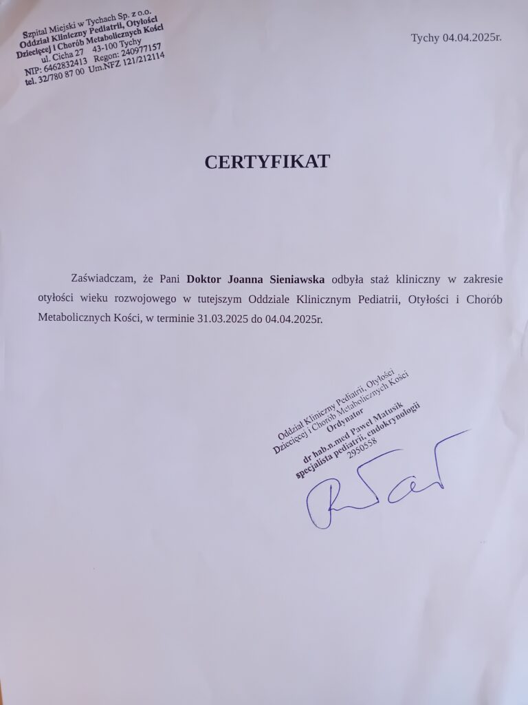 dr n. med. Joanna Sieniawska jest członkiem wielodyscyplinarnego zespołu ds. leczenia otyłości dziecięcej. Stale poszerza swoją wiedzę, uczestnicząc w konferencjach i szkoleniach organizowanych w Polsce i za granicą. Jest autorką publikacji naukowych z zakresu endokrynologii pediatrycznej w czasopismach polsko- i anglojęzycznych.