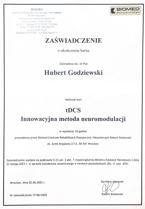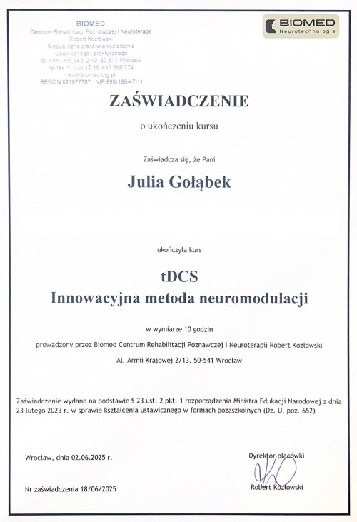 Zabiegi tDCS w naszym ośrodku wykonują doświadczeni lekarze i psycholodzy, którzy stale podnoszą swoje kompetencje. Każdy z nich posiada aktualne certyfikaty potwierdzające wiedzę i umiejętności w zakresie neuromodulacji tDCS.